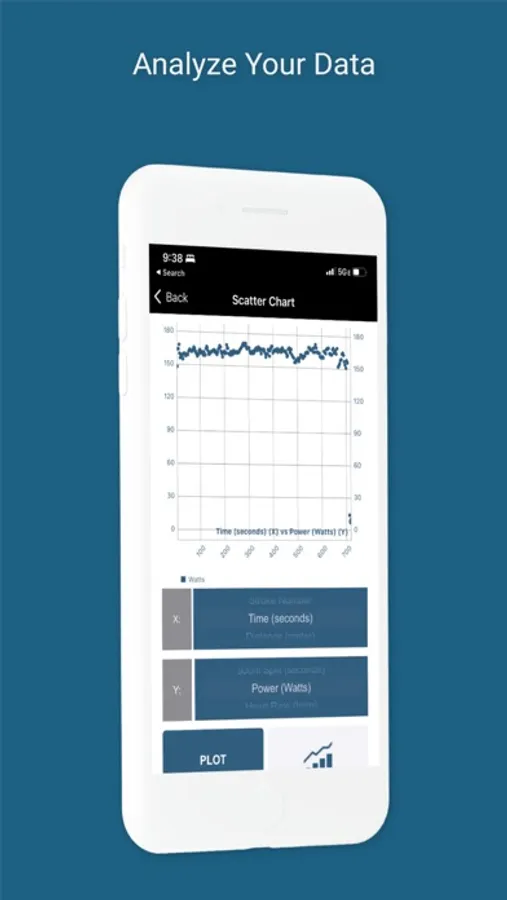Rowing data can now be analyzed using a graphing screen. Users can select which variables they want to plot on the X and Y axis. Users have two options 1) A scatter plot graph which allows for any two variables to be plotted on the x and y axes. 2) A line graph which allows for plotting on any variable against time, distance or stroke count.