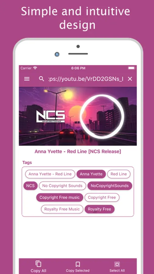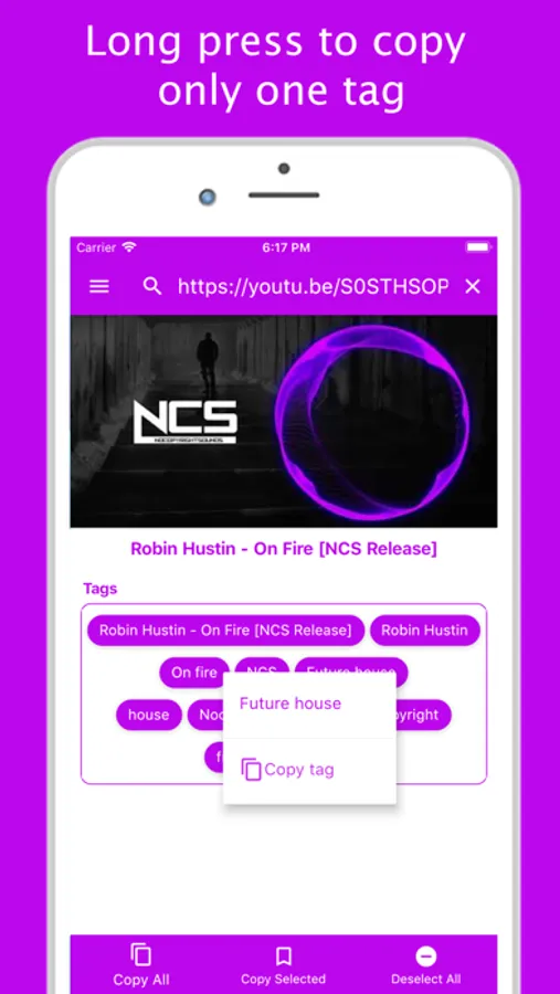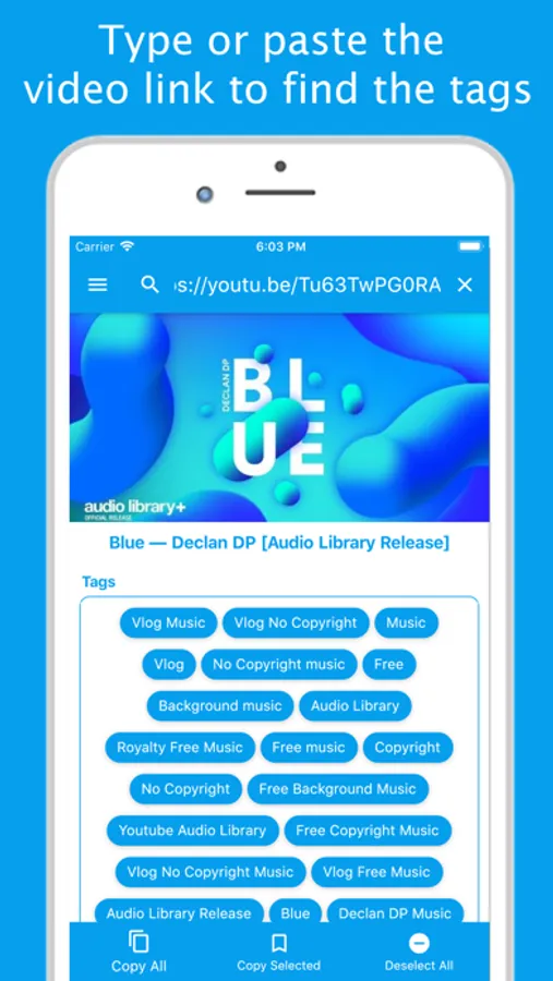 Using the application is very simple. Press the search button and type or paste the video link into the search field. When you run the search, the video tags will be displayed. These tags can be selected and copied to be used in your channel videos. In addition to that also it is possible select and copy a tag individually doing a long click over it.