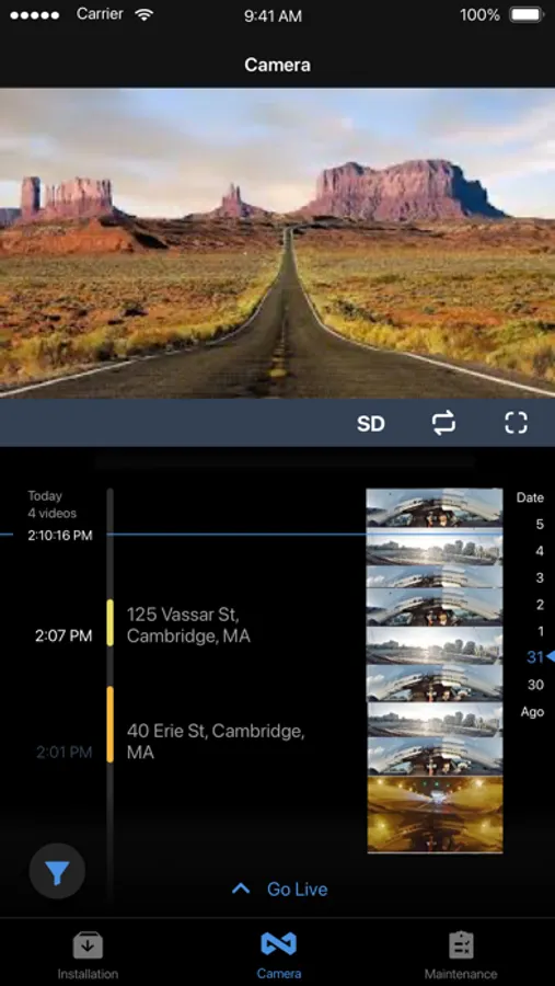 Fleet Managers can connect to the camera to review historical video from the SD card. Once a video segment of interest is found, they can choose to share it from their smartphone. Filtering capabilities make it easy to identify risky events requiring review, saving managers from sifting through hours of historical video.