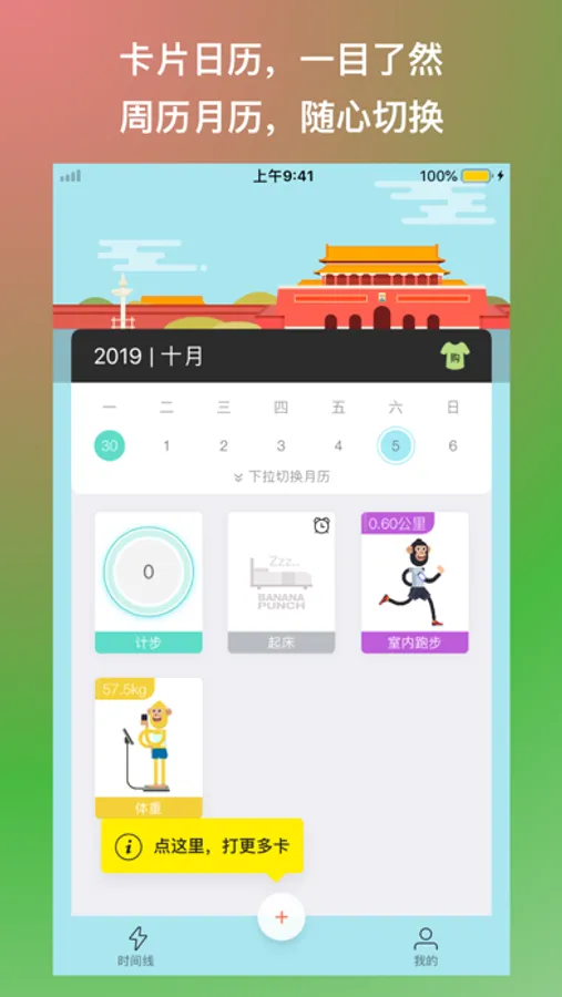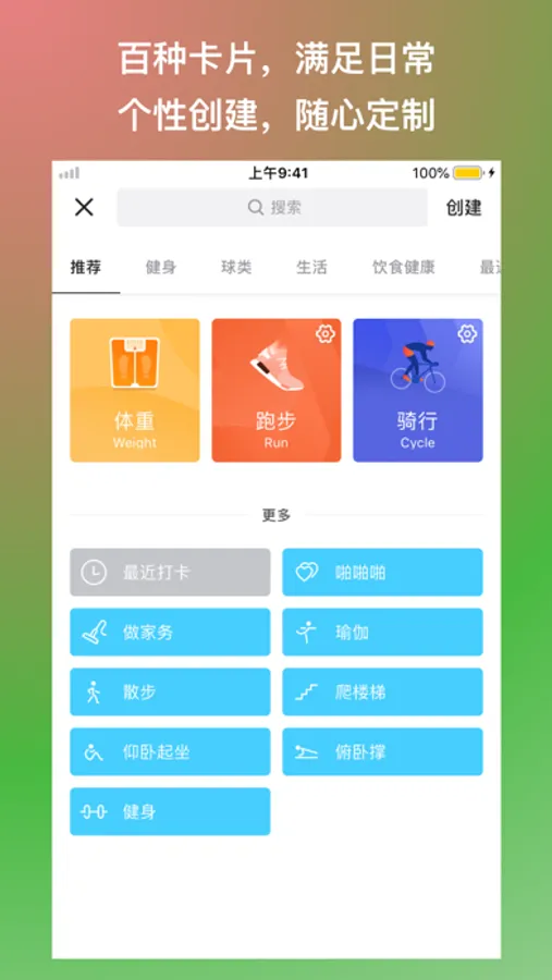 —— 跑步、计步、骑行、体重、起床……丰富的卡片类型满足日常打卡需求。除了当前已提供的卡片类型,用户还可以创建自定义卡片,记录更加完善。
