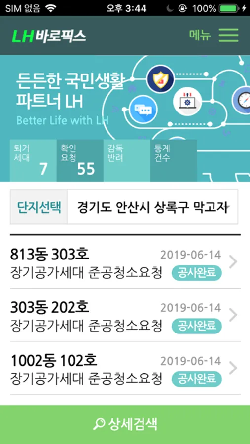- 하자민원조회, 신규접수, 처리 및 완료보고 하자민원 건을 관리소에서 확인하여 LH 지역본부 감독관에게 완료확인 요청을 할 수 있습니다.