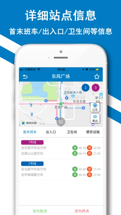 详细站点信息:站点首末班车时间,车站服务设施(卫生间和电梯等)、出入口信息等。