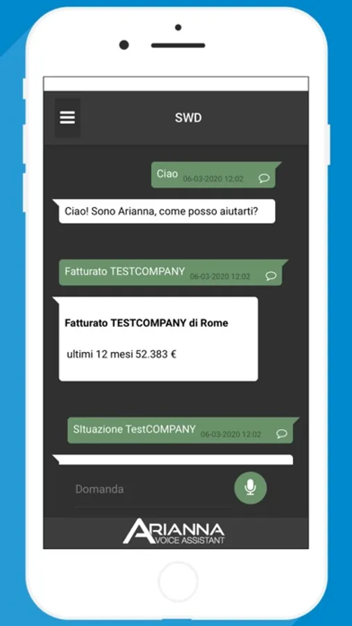 Arianna Voice è un Business App assistente vcale che risponde a domande in linguaggio naturale con i dati estratti dal proprio gestionale aziendale, di presenze ed altri sistemi interni.