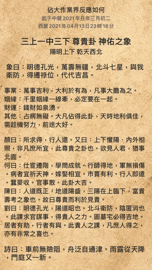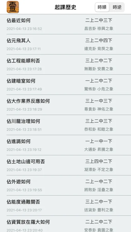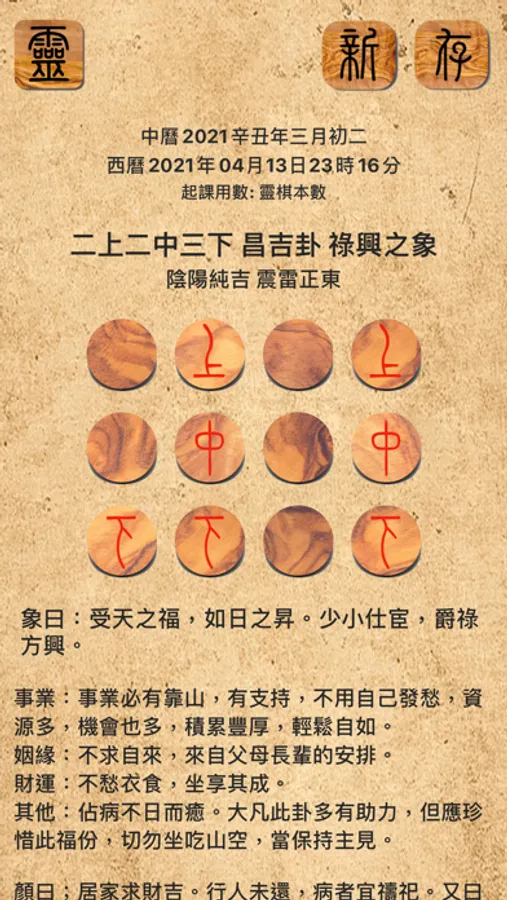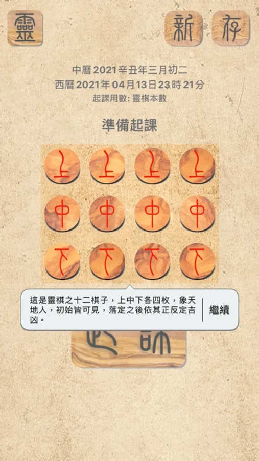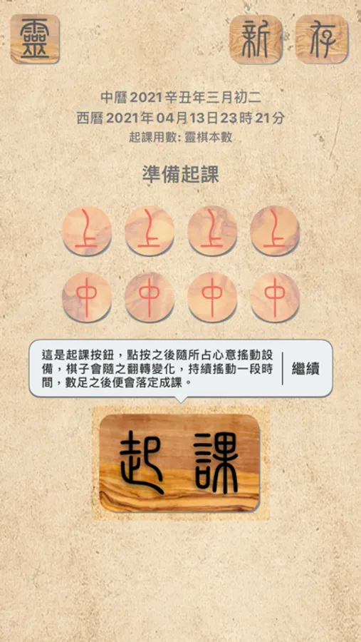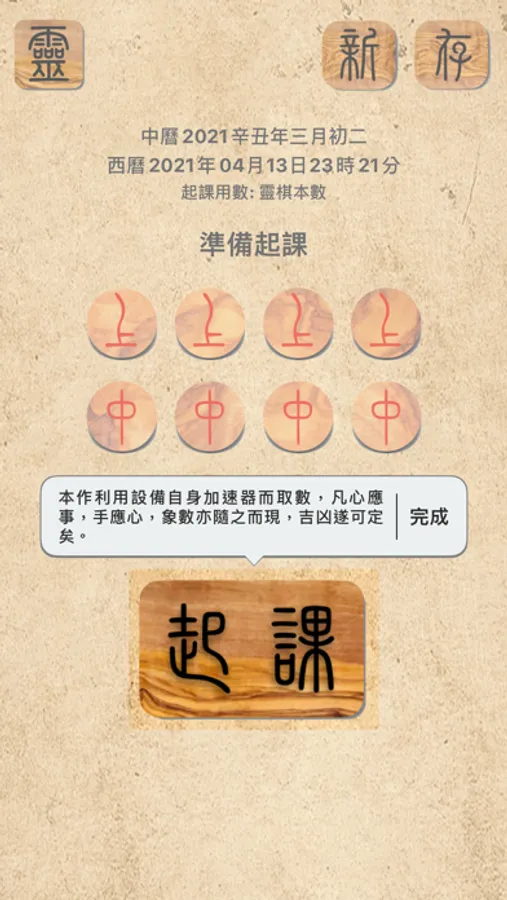現在將此法在iOS中重現,得益於掌端之科技,本作的優勢有三。一是利用手機內部加速度感應器的取數來起卦,占事者只要搖動手機數秒便可得卦,這不但類似於實際用棋子起卦以增強帶入感,更解決了偽隨機數的問題。二是本系統加入了三種不同的起課用數,分別為靈棋本數、洪範九數與天地全數,各有不同的用法與側重。三是加入了更為現代的解課之辭,此是由作者多年的占卜經驗得來,能讓現代人更為方便的了解卦象含義。目前尚有部分卦辭未能完成,但後續會儘快更新。不負賢者所托。