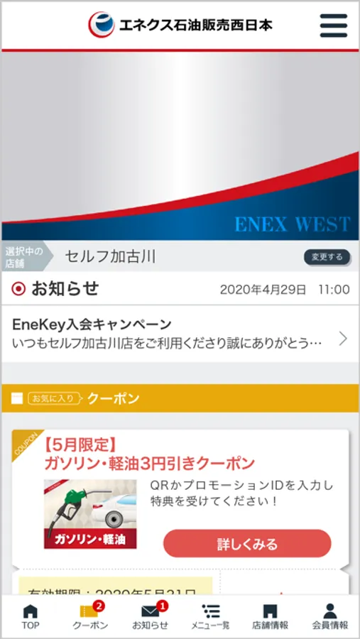 「【公式】エネクス石油販売西日本」のダウンロード・ご利用は無料です。アプリダウンロード後にご希望の店舗をご登録の上、ご利用ください。