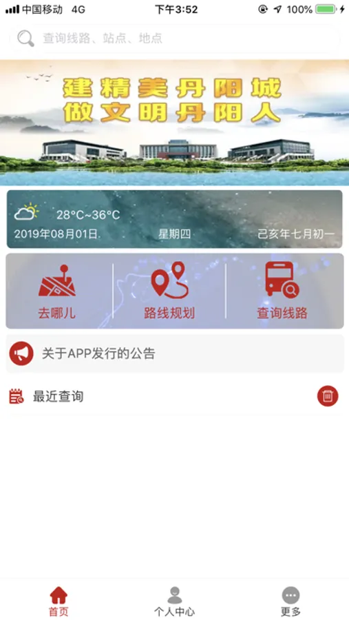 为丹阳市老百姓提供公共出行服务,主要包含了查看天气,公告,线路查询,路线规划,个人中心,意见反馈等。