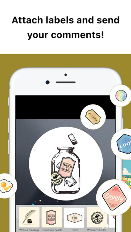 You can put text messages in the bottle or affix various labels such as “Very stylish!” or “Your illustrations are lovely!” to casually send your comments to the creator.
