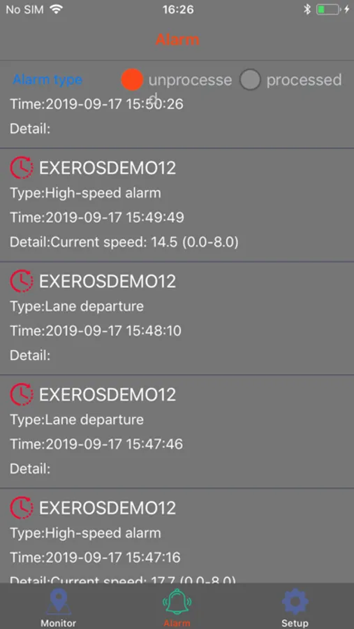 Real-Time Events & Alarms: Events and alarms are date and time stamped and can be processed as or after they happen. Events are labelled to determine what the event type is. Typical examples include; instances of harsh breaking, sudden acceleration or sharp turning, overspeed alarms and turning alarms, such as, reversing and left and right turn. Other customised alarms are available upon request.