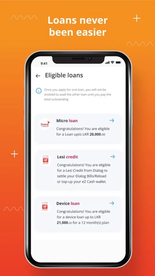 Introducing Lesi Credit - a new facility. Enjoy the feature and utilize the grant against selected Dialog Services (pay your Dialog Mobile/DTV/HBB bills etc) or top up your eZ cash wallet and repay the loan based on the stipulated monthly installments.