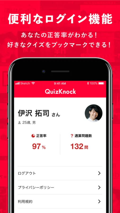 これまでに挑戦したクイズの通算問題数や、その正答率を見ることができます。