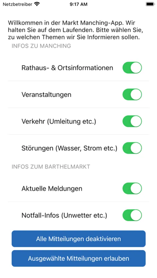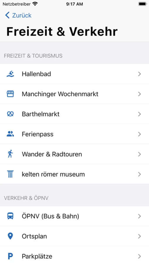 Unterteilt ist die App in folgende Kategorien: „Aktuelles“, „Bekanntmachungen“, „Wir sind für Sie da!“, „Sofortnachrichten (Push)“, „Leben in Manching“, „Freizeit & Verkehr“, „Downloads & Videos“, „Veranstaltungen“, Barthelmarkt“ und „www.manching.de“.