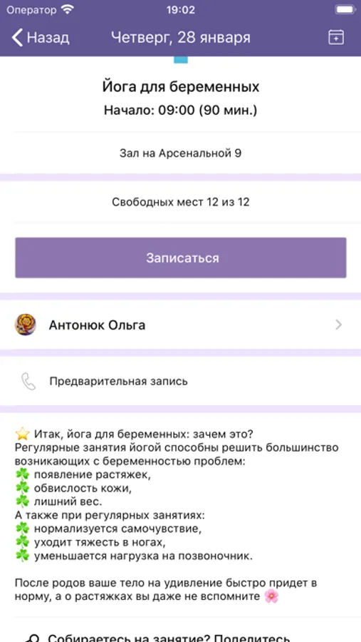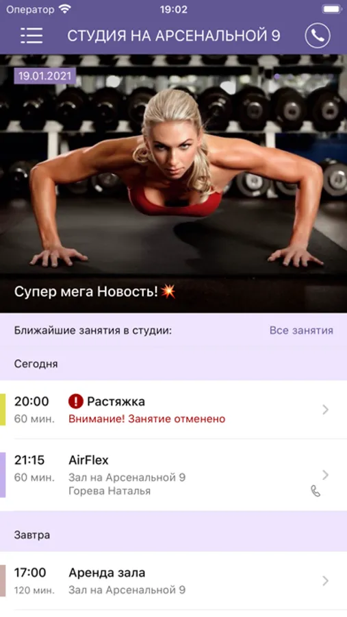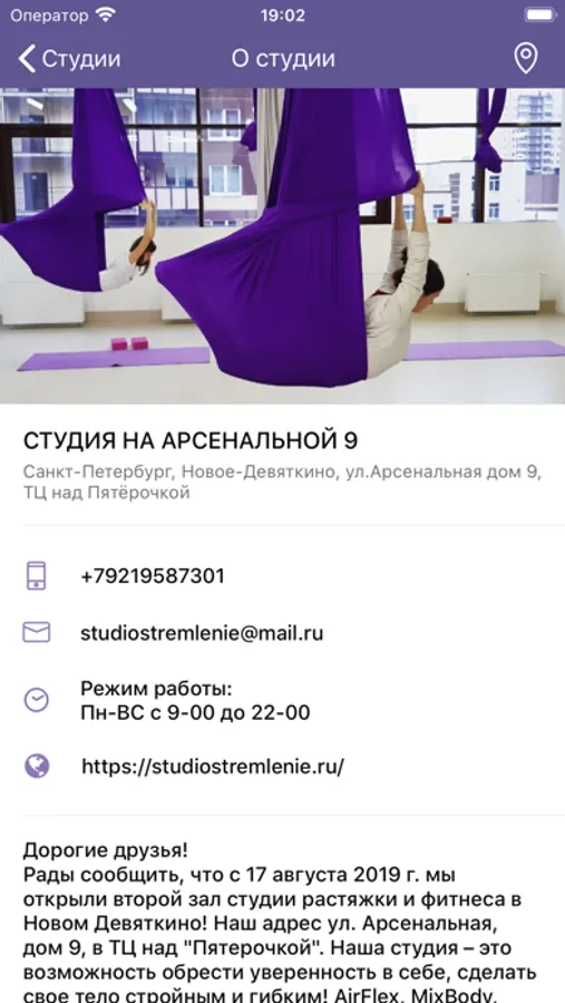 С помощью приложения вы можете следить за новостями, расписанием студии, записаться на занятие, оперативно получать информацию об изменениях в расписании и специальных предложениях.