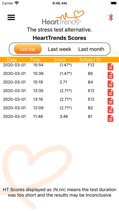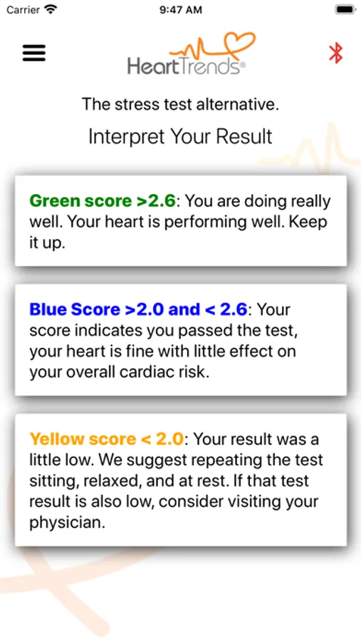 HeartTrends: an effortless stress test alternative for early detection of cardiac ischemia in healthy individuals. It analyzes 20 minutes of heart beat data. Scores above 2.0 are indicative of good health. If below, consider repeating the test under relaxed, sedentary conditions. HeartTrends does not offer a diagnostic opinion to the individual. That is the responsibility of the physician.