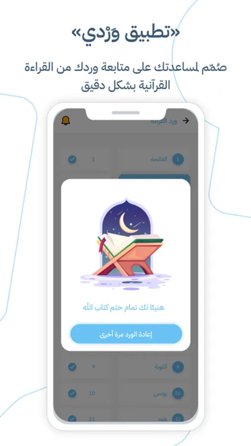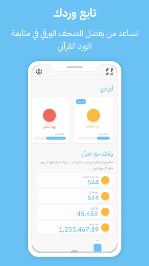 تطبيق وِردي, تابع ختمتك في المسجد, البيت, العمل, غرف الانتظار, مع المصحف الورقي أو تطبيقك المفضل. حمّل #وِردي وتابع وردك.