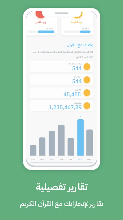 • تقارير تفصيلية يومية وأسبوعية لعدد الختمات والسور والآيات والحروف التي قرأتها.