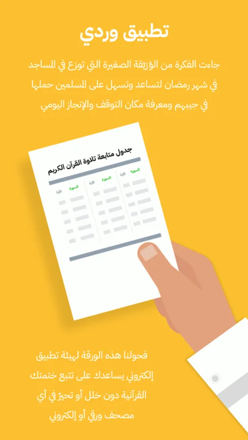ببساطة, قمنا بأخذ جدول الورد القرآني -المعتاد قديما عند القرّاء- المحمول في الجيب لمتابعة مكان التوقف والإنجاز اليومي, ثم حولنا هذا الجدول إلى تطبيق إلكتروني يساعدك على متابعة ختمتك دون الحاجة إلى التحول عن المصحف الورقي.