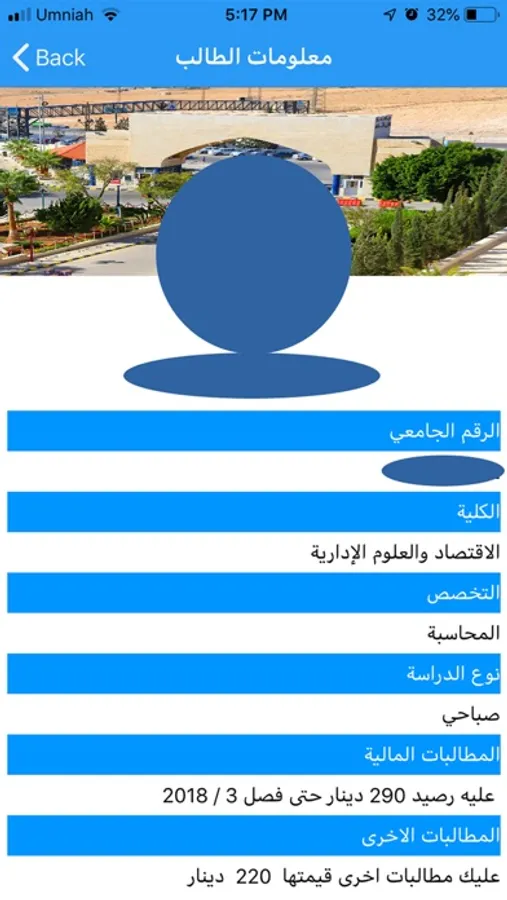 وفيما يتعلق بمعلومات الطالب الخاصة فيمكنه الأستعلام عن معلوماته المالية وعن علاماته حسب سنة وفصل معين وايضا يمكنه مشاهدة الجدول الدراسي للفصل الحالي أو الإستعلام عن جدوله لفصول سابقة ويتيح التطبيق للطالب معرفة مواعيد إمتحاناته ومواعيد التسجيل ويمكن للطالب مشاهدة المواد المطروحة للفصل المراد التسجيل فيه ويمكن للطالب معرفة غياباته عن المواد المسجل بها ومواعيد الغياب.