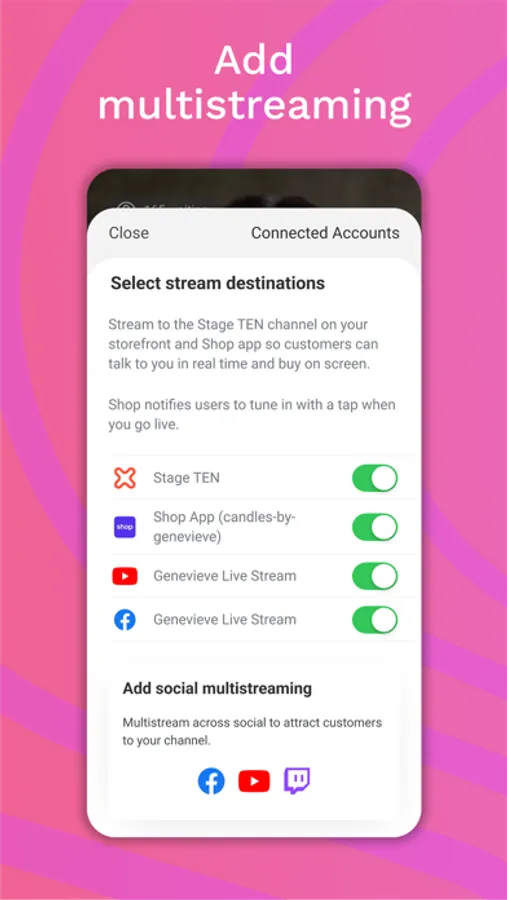 You can also multistream across social and attract people to your Stage TEN channel to interact and make purchases.