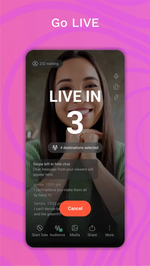 When you’re live, Shop app notifies an instant audience network of qualified buyers. They can tune in with a tap, interact and checkout on screen right in Shop.