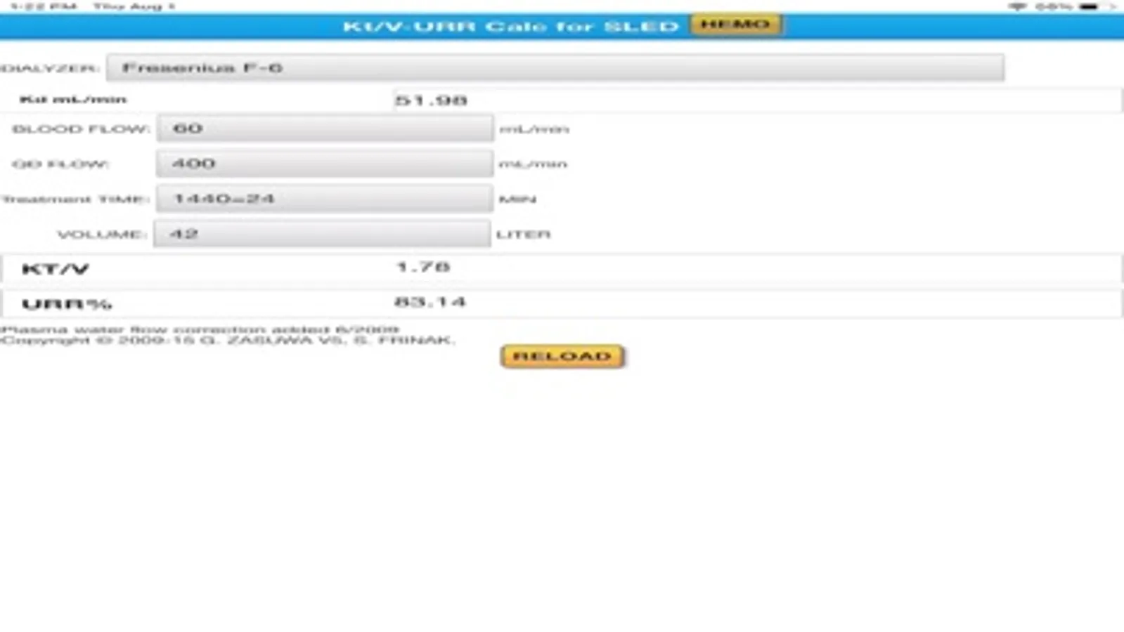 Automatically calculates hemodialysis efficiency (K*t/V) using single-pool kinetics and mass transfer coefficients of a selection of popular dialyzers. Choosing a dialyzer instantly calculates this important parameter for nephrologists prescribing dialysis. One can change the blood flow dialysate flow, treatment time and water volume of the patient to compute the expected dialysis efficiency.