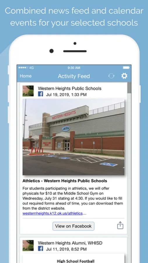 Stay informed of school and district announcements, activities and events from Western Heights Public Schools. Select a preferred list of schools and monitor activity from several social networks, including Facebook and Twitter. Transfer any activity or event directly to your iOS calendar with a single tap.