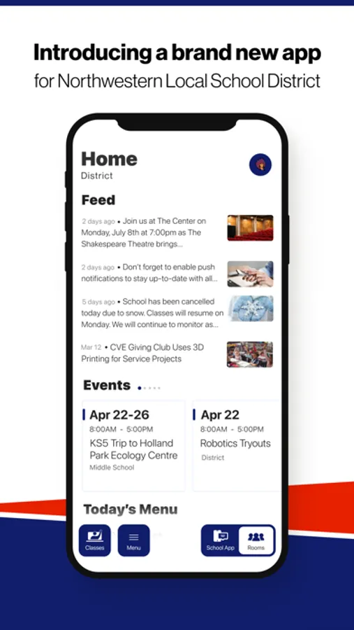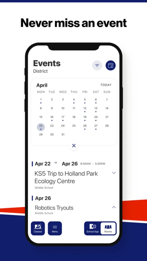 The event section shows a list of events throughout the district. Users can add an event to your calendar to share the event with friends and family with one tap.