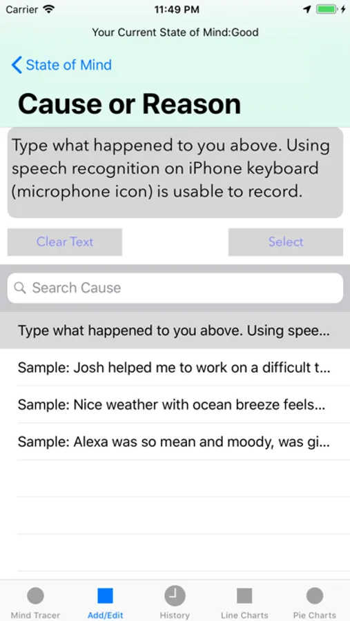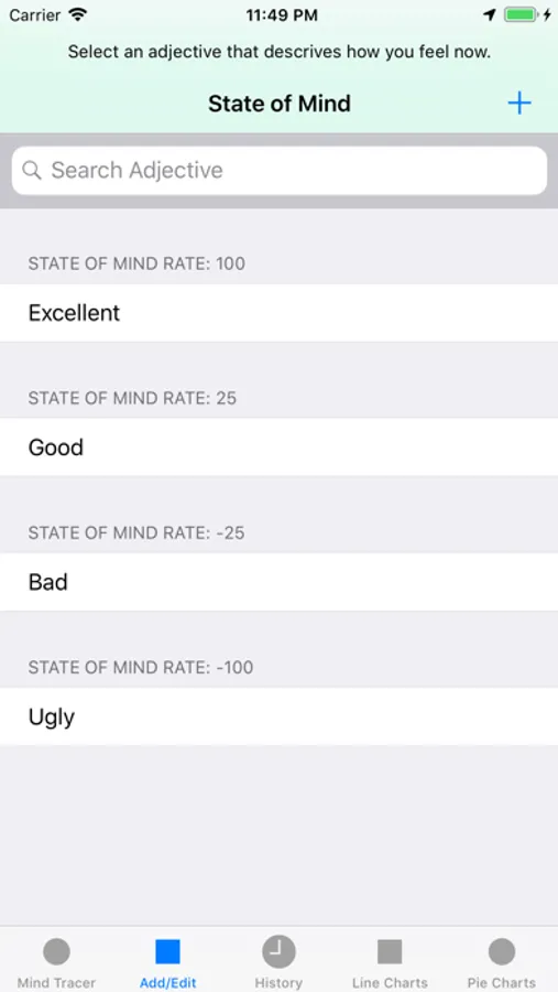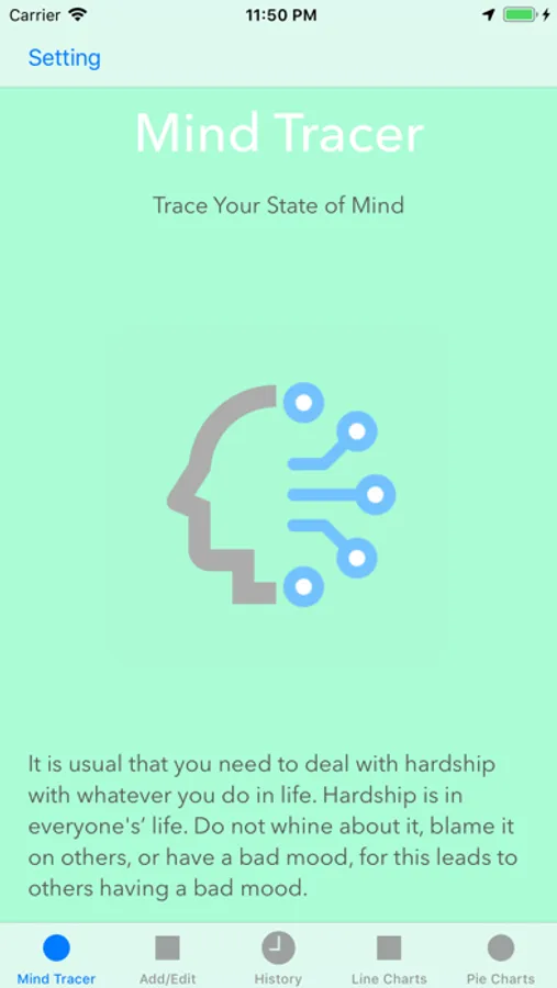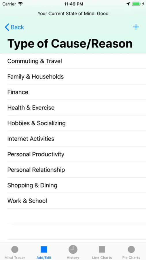 Log your state of mind and analyze what's causing the negative or positive effect on your life and work, where, when, and how often. Words of wisdom are displayed if it's associated with the most troubling casue type. You can set the data input reminder at hourly to daily basis, and new destination. You can customize its use by adding, editing, and deleting your words of wisdom, state of mind adjectives, cause description, cause types, and locations.