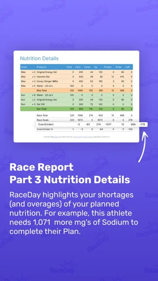 The “RaceDay” app outputs a concise race-plan pdf report in an elegant format. To optimize the plan, the user can create any number of plans by adjusting the pace numbers and nutritional fueling inputs best suited to match the forecasted weather conditions. Validate your race plan with the Brick Training feature built into the app.
