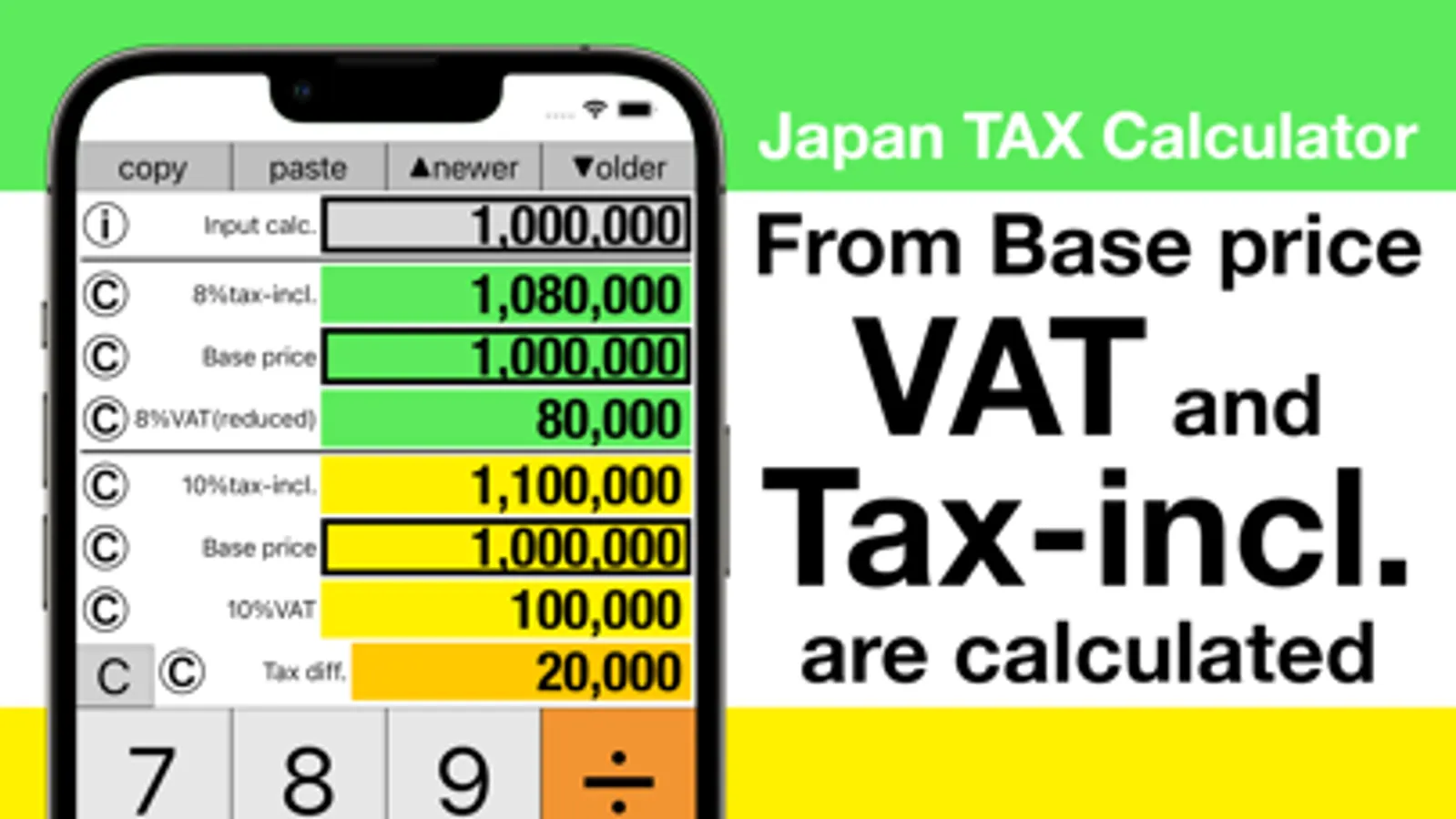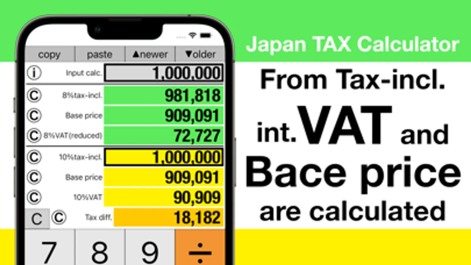"Japan TAX calculator (VAT)" calculates Japanese consumption tax (VAT) and others by using a calculated price as 10% tax-included price, 8% tax-included price, or Base price.