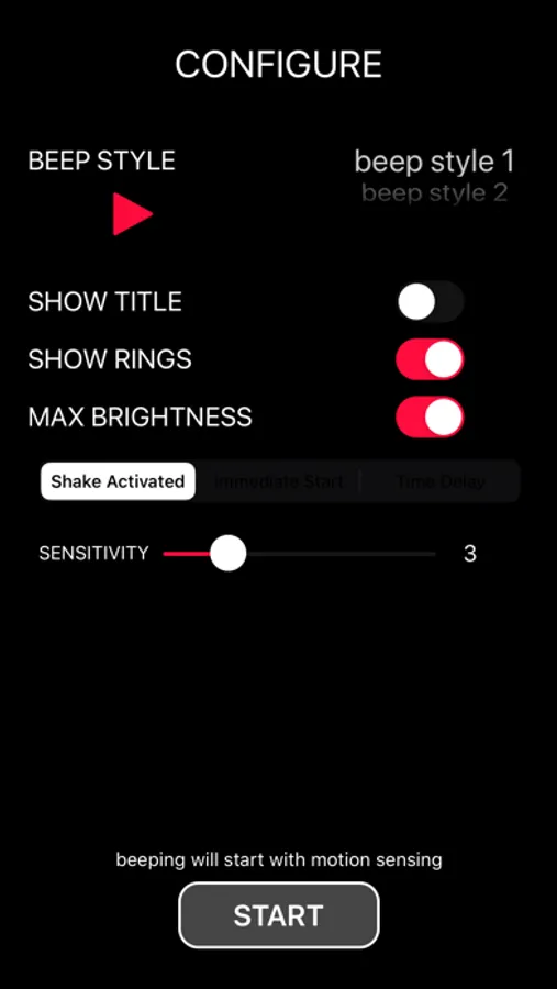 The app also includes visual elements including a set of flashing rings that can be turned on and off.