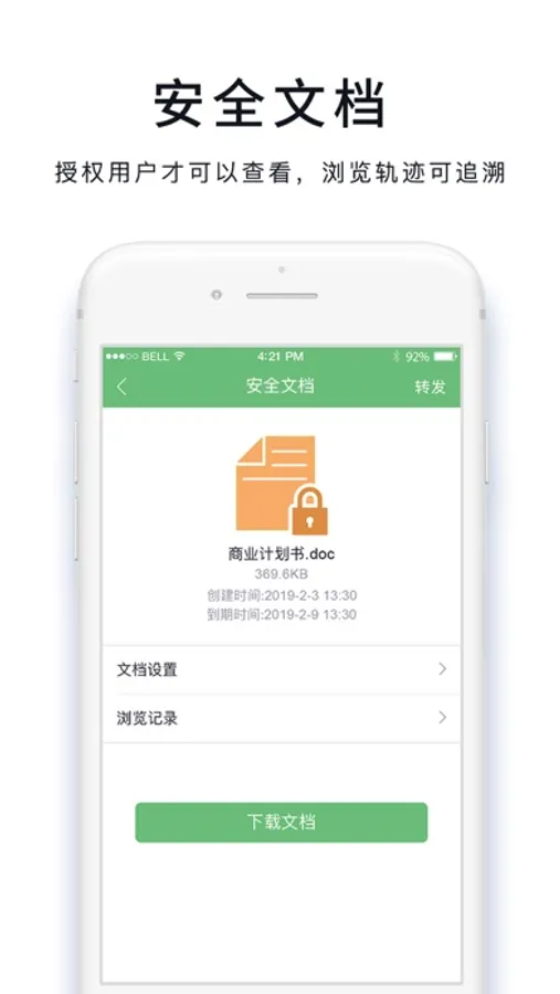 重要文档安全管控:“安全文档”实现对重要文档加密后发送,只有指定的接收方才能打开,阅读及转发,通过权限控制、阅读与传播轨迹记录、内嵌水印保证泄密可追查等手段实现文档安全管控。
