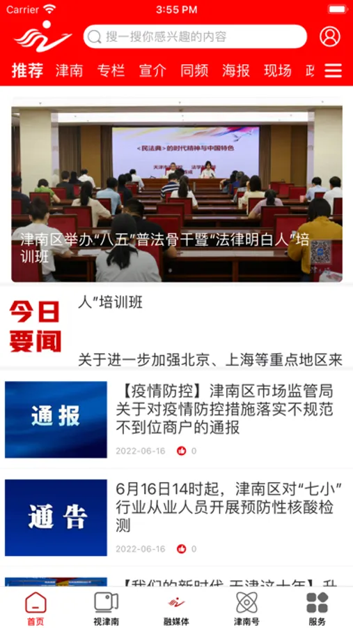 首页为新闻功能,位于底栏首位,为网民提供与津南区有关的新闻资讯。“首页”新闻版块细分为推荐、要闻、现场、公告、旅游、文化等6个子版块。