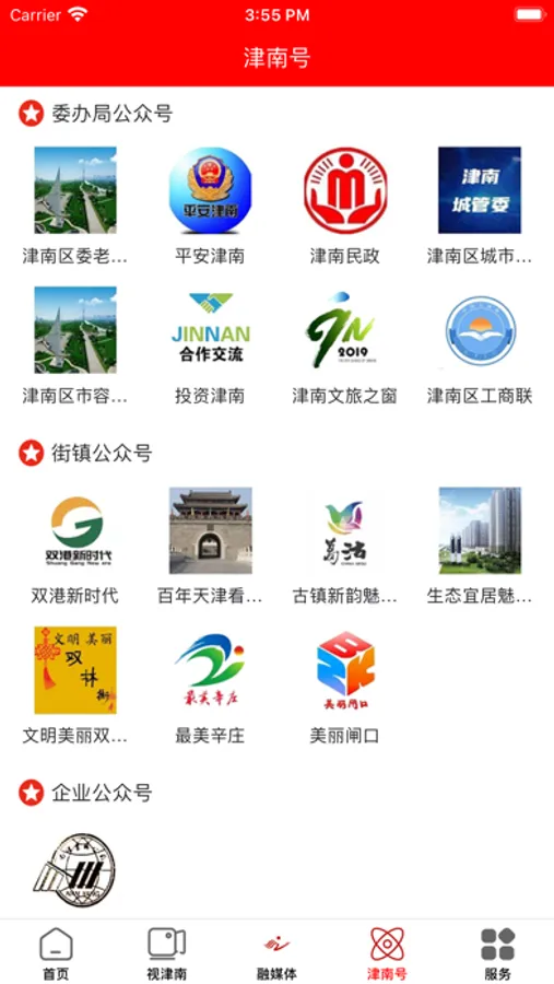 津南号版块,分为关注乡镇和关注单位两个栏目,汇集全区所有重要的微信公众号资源入驻,全天候提供各种资讯。