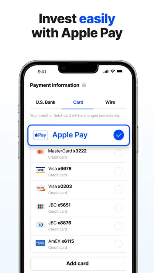 Anyone 18 years or older can invest.* Accessible to new and experienced investors. Option to invest directly with your credit card using Apple Pay.