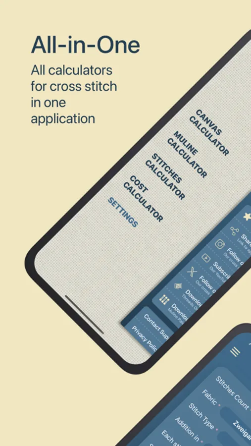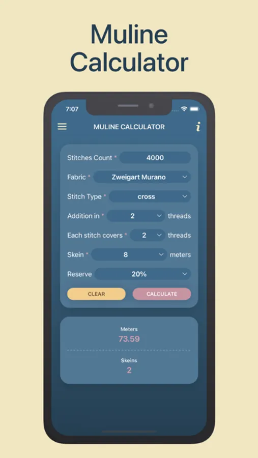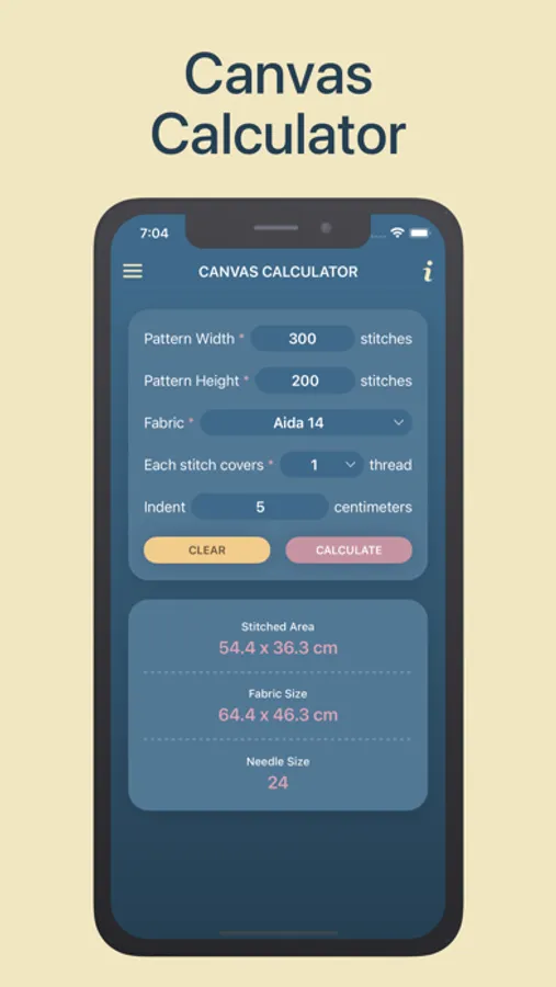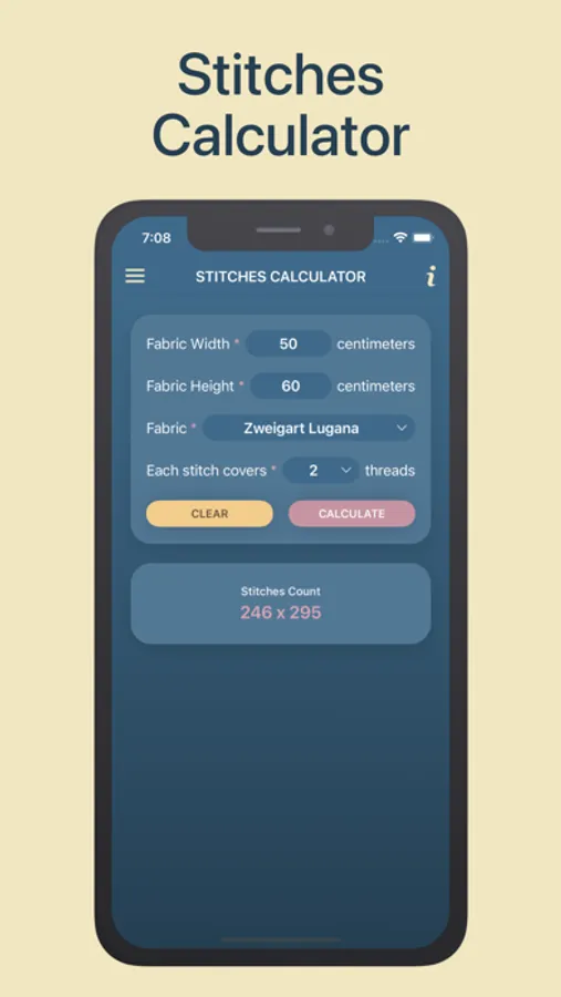 The stitches calculator helps you calculate the size of the selected fabric for the specified number of stitches in the pattern.