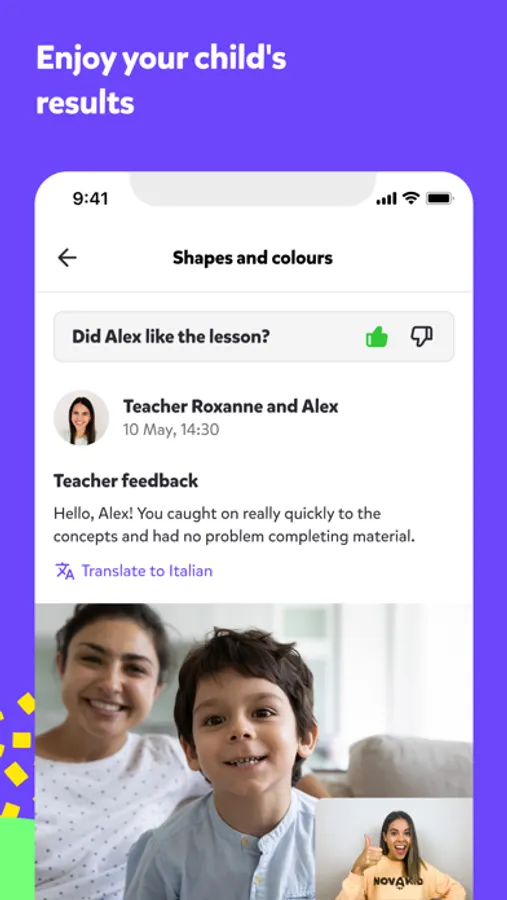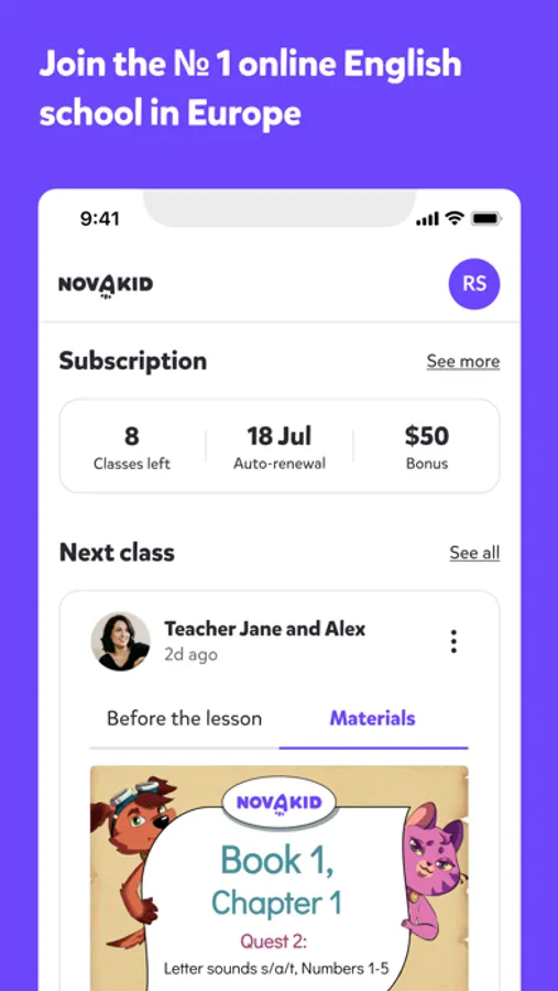 The application is developed specially for Novakid parents. Now with the app it's easy and convenient to control schedule and balance, get important notifications and track student’s progress.