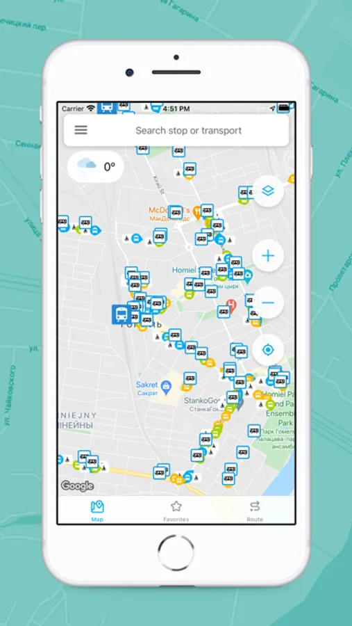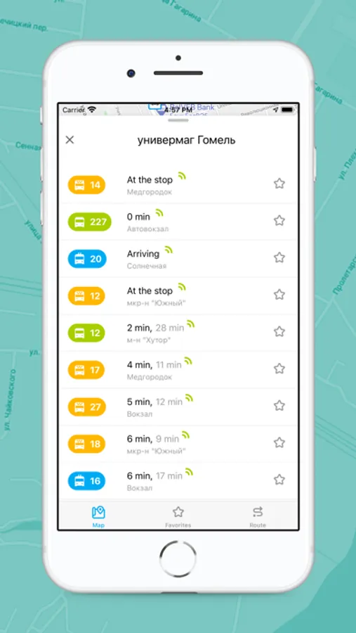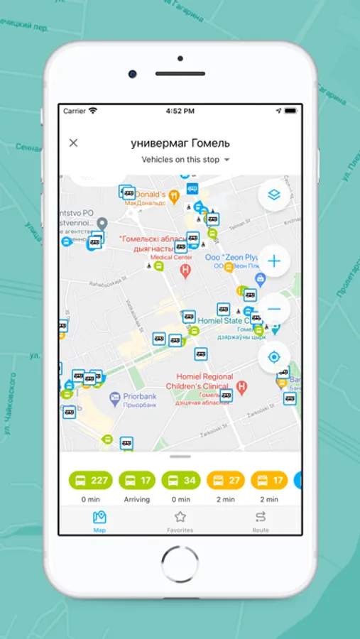 Mark your favorite public transport routes with an asterisk to quickly find them in Favorites. This can be done at any stop. A transport stop will be added to Favorites if at least one route marked passing through this stop. Now you can go to a stop or view the entire route with just one click. It is easy and quick.