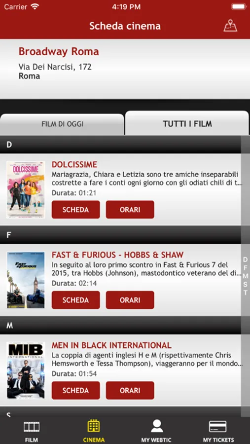 Applicazione di Crea Informatica, per l'acquisto e la prenotazione dei posti nel prestigioso cinema Broadway di Roma.