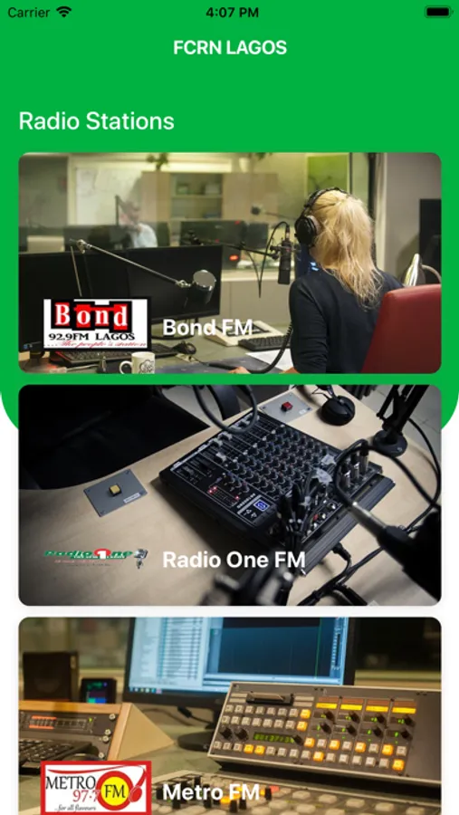 The Federal Radio Corporation of Nigeria is Nigeria's publicly funded radio broadcasting network. This app consists of the live streaming feeds of the three broadcasting stations of the FRCN Lagos operations, namely: Bond 92.9 FM, Metro 97.7 FM & Radio One.