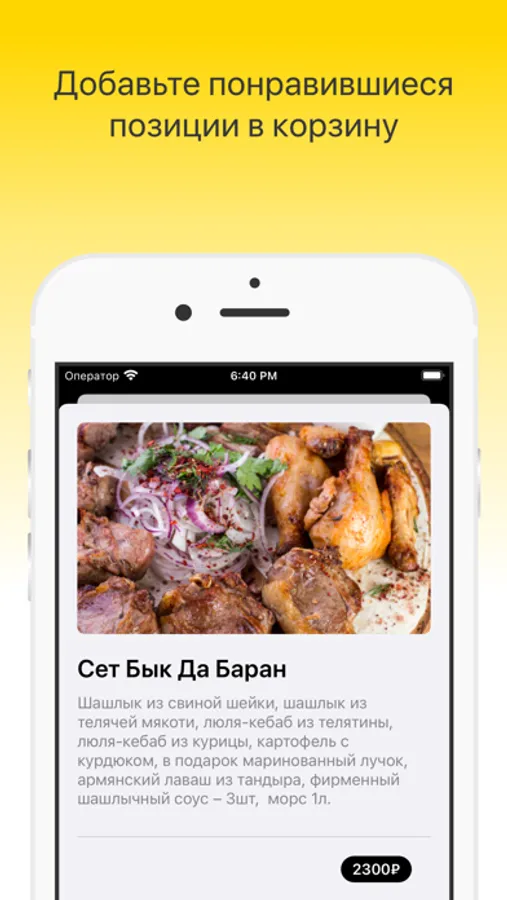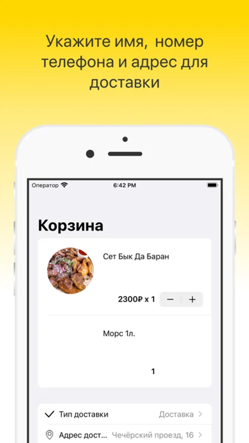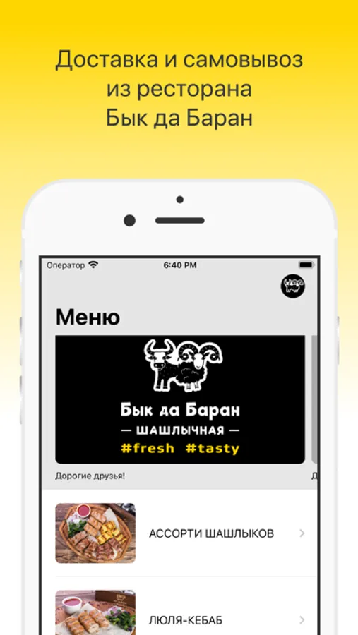 Как сделать заказ в приложении “Шашлычная Бык да Баран”: выберите понравившиеся позиции из меню, добавьте их в корзину и перейдите на экран оформления заказа (по нажатию на иконку корзины).