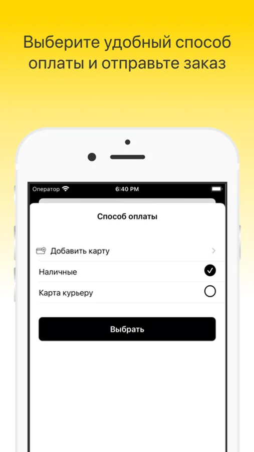 Выберите способ оплаты: Наличными или картой. Примите правила оплаты и нажмите кнопку “Заказать”.