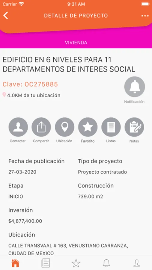 Podrás agrega notas y alertas que te permitirán recordar datos relevantes de cada obra de tu interés para que no te pierdas la oportunidad de negocio que representa para tu negocio o empresa.