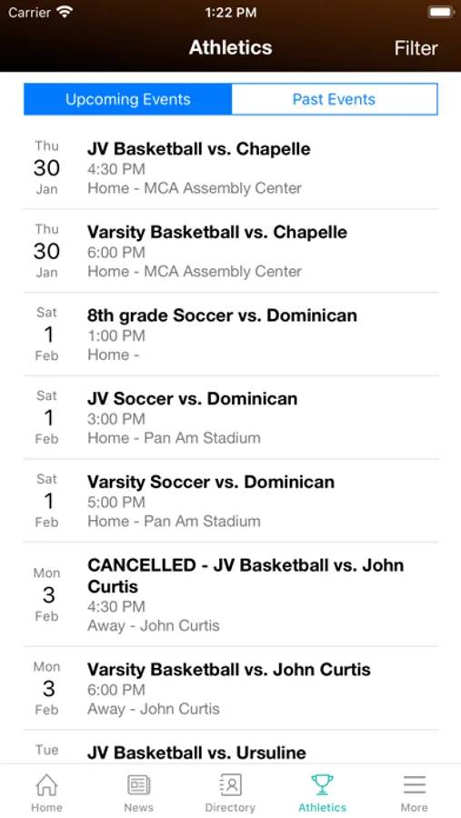 ● Review athletic event details, including opponents, game results, recap commentaries, and more