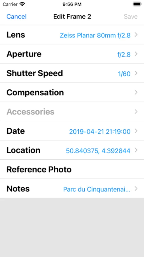 • Quickly log settings for each photo including date, lens, aperture, shutter speed, exposure compensation, as well as location coordinates, accessories, and notes about the shot.