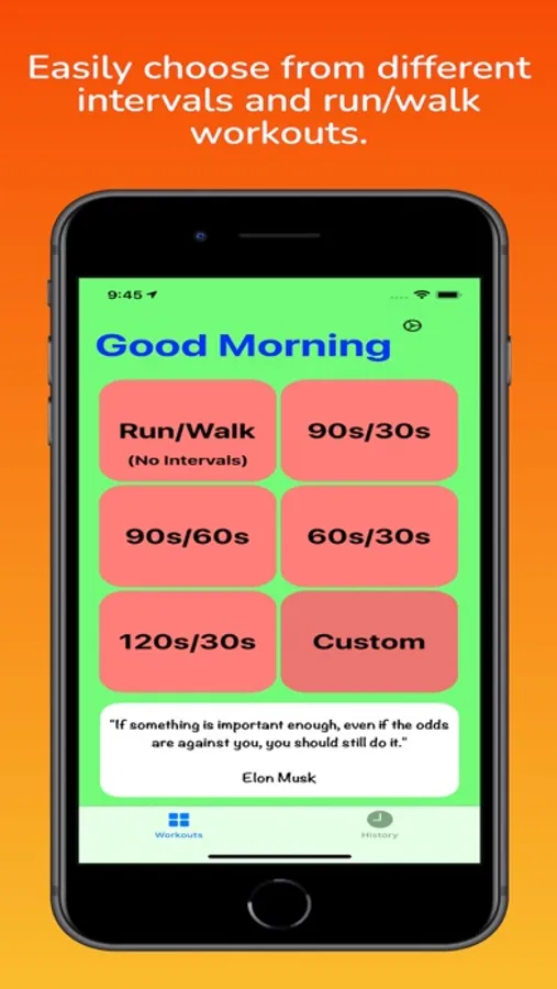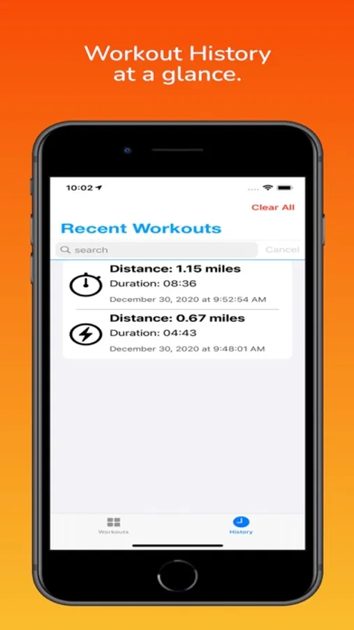Well, you're not in it for the intervals? That's okay, we got continuous run/walk tracking too. Your workouts run in the background with music and provide you the important information of the workout including distance covered, duration, number of sets, pace, etc. as applicable. All workouts are saved in the 'History" tab, with a symbol and date that can help you find the one you are looking for.