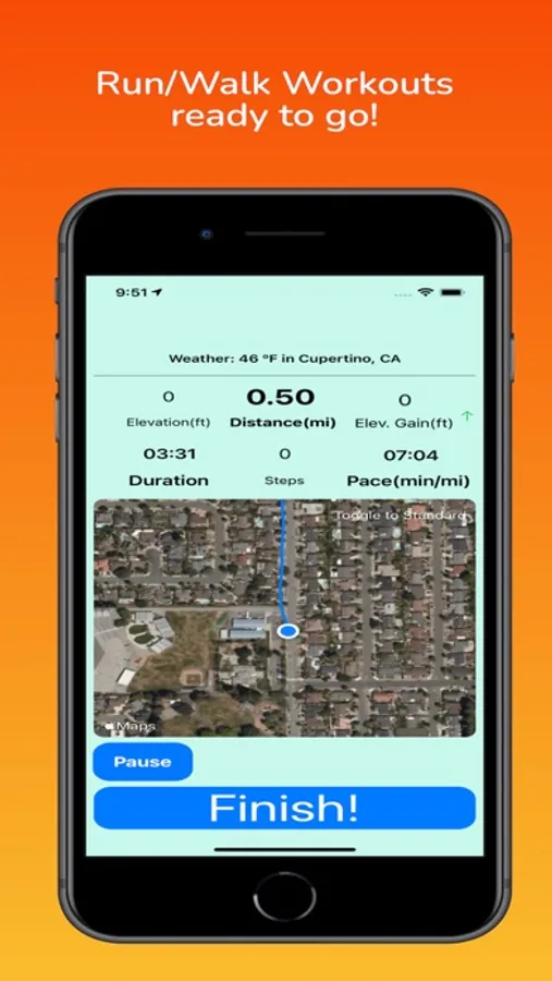 - Continuous Run / Walk option without intervals and track key workout statistics, such as distance, steps, duration, and pace.