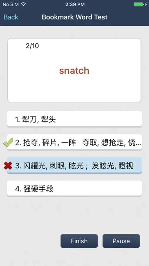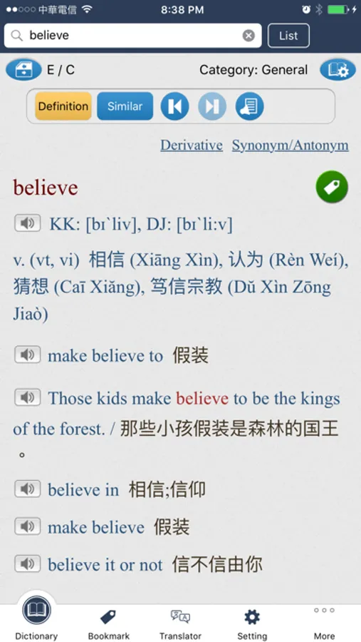 Save words to the Bookmark for future review. Bookmark content can be classified and edited. Flash card practice and self test functions are also included in Bookmark.