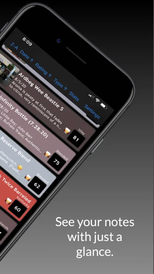 *Quickly sort all of your whiskies alphabetically, by date, by your rating or by type.