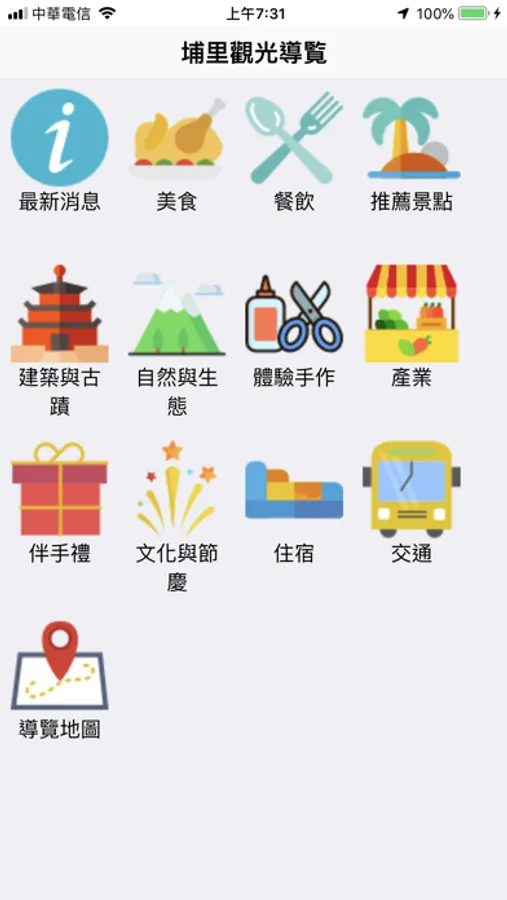 提供埔里觀光導覽相關資訊,包含「最新消息」、「推薦景點」、「美食」、「伴手禮」、「住宿」、「導覽地圖」等主題。結合iBeacon信標定位,提供遊客埔里觀光導覽所需相關資訊,還可以透過最新訊息獲得最新活動消息。