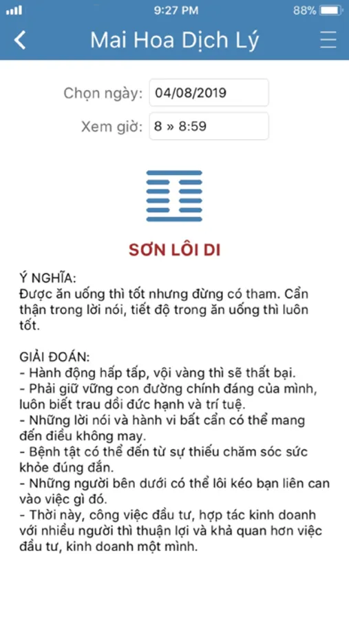 - Dịch lý: Lấy quẻ Mai Hoa Dịch theo ngày giờ
